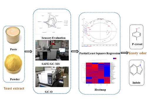 宋诗清教授指导的18级研究生汪卓琳采用GC-O、感官分析和偏最小二乘回归(PLSR)分析相结合,鉴定出四种酵母提取物的不同风味物质。研究发现,对甲酚和吲哚具有酚味和动物味,是引起酵母提取物异味(酵母味)的重要原因。更重要的是,吲哚是首次报道对酵母味具有重要的作用。该文章发表在美国ACS期刊Journal of Agricultural and Food Chemistry(JCR一区,影响因子3.571),该工作对进一步解决酵母异味的问题奠定了理论基础。