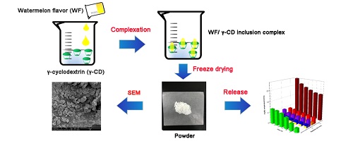 肖作兵教授团队根据主客体化学原理,采用分子包络法成功制备了一款新型西瓜纳米缓释香精,该缓释香精装载率高、热稳定性好、缓释性佳,在食品、日化、纺织、皮革、造纸等行业具有广阔的应用前景。同时,该课题组还研究了香气成分在缓释香精中的释放规律,为今后缓释香精的精准设计提供了理论依据。相关研究成果Encapsulation and sustained release properties of watermelon flavor and its characteristic aroma compounds from γ-cyclodextrin inclusion complexes发表在Food Hydrocolloids(JCR一区,影响因子5.839)。