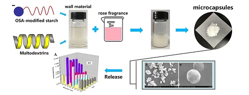 该研究团队还以辛烯基琥珀酸淀粉酯和麦芽糊精为壁材,玫瑰香精为芯材,制备出一款安全环保、且具有控释效果的淀粉基玫瑰缓释香精,并深入研究了辛烯基琥珀酸淀粉酯和麦芽糊精对玫瑰香精中特征香气物质释放的影响。相关研究以Microcapsules based on octenyl succinic anhydride (OSA)-modified starch and maltodextrins changing the composition and release property of rose essential oil为题发表在International journal of biological macromolecules(JCR一区,影响因子4.784)。