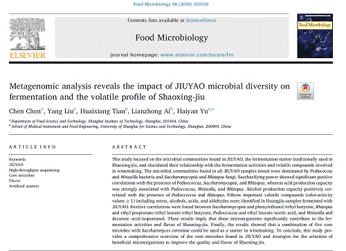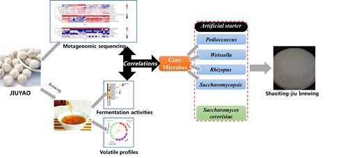香料学院“食品风味调控创新团队”于海燕教授和陈臣副教授等以传统绍兴酒的酒药为研究对象,采用宏基因组技术鉴定了酒药的核心菌群,并通过相关性分析研究了绍兴酒药的微生物结构,绍兴酒的发酵活性和挥发性成分之间的关系。研究全面概述了 “酒药”中的核心微生物以及选择有益微生物以改善绍兴酒质量和风味的策略,有效改善绍兴黄酒的发酵活力和香气品质,进一步推动传统绍兴黄酒的工业化生产,研究成果发表在国际知名期刊Food Microbiology(JCR一区,影响因子4.089)。