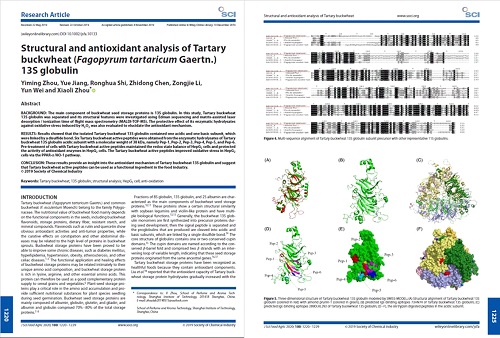 周小理教授团队在优化高活性荞麦蛋白(BP-1)制备技术的基础上,通过采用复合酶酶解和基质辅助激光解析电离-飞行时间质谱分析(MALDI-TOF)技术,明晰了该蛋白的主要活性位点和结构信息,对荞麦功效形成的机理研究提供了理论依据。相关研究成果也发表在发表在国际知名期刊Journal of the Science of Food and agriculture上。