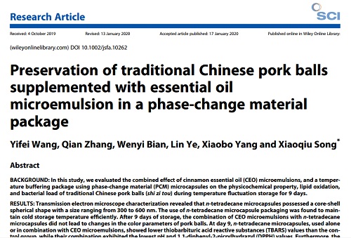 宋晓秋教授率领“功效因子装载技术”团队开发的综合性冷链保鲜策略,结合4℃蓄冷材料微胶囊和植物精油微乳液两大功效因子装载技术,以熟肉制品为研究对象,延缓了其在波动冷链温度贮藏期间的品质劣变,为生鲜物流降低冷链能耗、提升效率和配送最后一公里等问题提供了新技术思路,同时,开拓了熟肉制品中天然抗菌剂和抗氧化剂的商业发展前景。研究成果发表在国际知名期刊Journal of the Science of Food and agriculture(JCR一区,影响因子2.422)。
